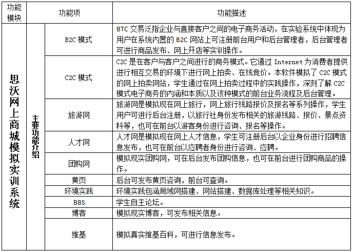 思沃網(wang)上(shang)商(shang)城(cheng)模擬實訓系(xi)統充分考慮到了(le)試驗的具(ju)體情況(kuang),系(xi)統針(zhen)對網(wang)上(shang)商(shang)城(cheng)模擬實訓進行相關配(pei)置,學生(sheng)可在(zai)系(xi)統中(zhong)體驗網(wang)上(shang)B2C、C2C模擬商(shang)城(cheng)開店實訓并結(jie)合(he)網(wang)絡環境的搭建、數據庫運用(yong)知識、團購(gou)網(wang)、在(zai)線(xian)旅游網(wang)、在(zai)線(xian)人才網(wang)等進行多元性的實訓系(xi)統。