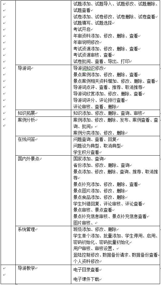 教師主要功(gong)能包(bao)括班級(ji)學生管(guan)(guan)(guan)理、導(dao)(dao)游(you)(you)基(ji)礎知識(shi)管(guan)(guan)(guan)理、國內(nei)導(dao)(dao)游(you)(you)知識(shi)管(guan)(guan)(guan)理、國外導(dao)(dao)游(you)(you)知識(shi)管(guan)(guan)(guan)理、情景題目管(guan)(guan)(guan)理、導(dao)(dao)游(you)(you)證(zheng)考試資(zi)料管(guan)(guan)(guan)理、模(mo)擬(ni)考試、導(dao)(dao)游(you)(you)詞管(guan)(guan)(guan)理、導(dao)(dao)游(you)(you)案例(li)管(guan)(guan)(guan)理、知識(shi)拓(tuo)展(zhan)、案例(li)分析管(guan)(guan)(guan)理、在線問(wen)答、國內(nei)外景點信息管(guan)(guan)(guan)理等。