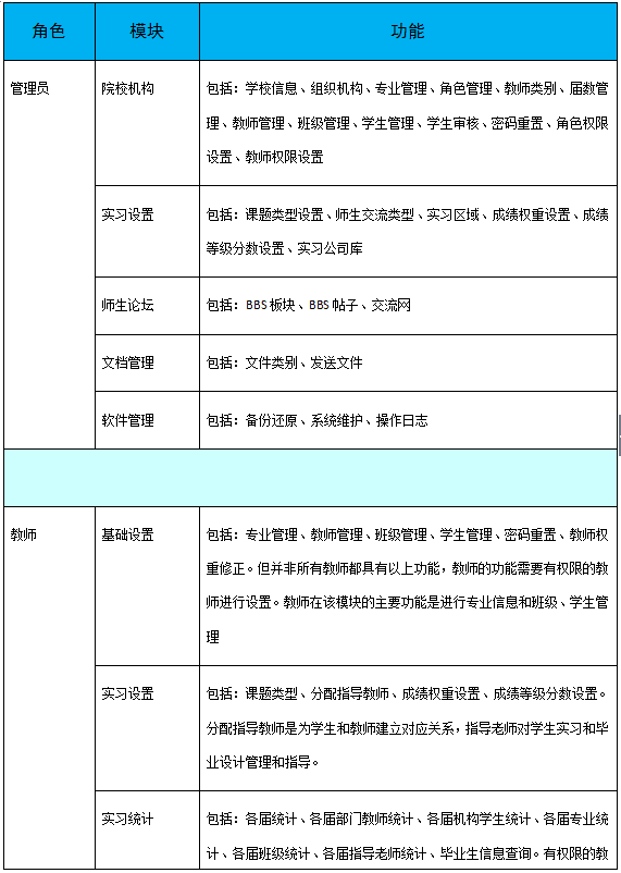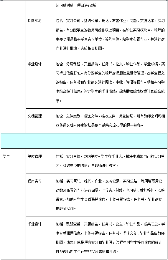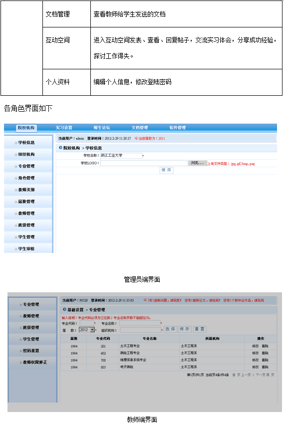軟(ruan)件按(an)(an)管(guan)理(li)(li)員(yuan)、教(jiao)(jiao)師(shi)(shi)、學生(sheng)分(fen)為三種用戶權(quan)限。其(qi)中,管(guan)理(li)(li)員(yuan)設置軟(ruan)件基礎信(xin)息,包(bao)括:學校(xiao)信(xin)息、院校(xiao)組織機構(gou)、屆數年份管(guan)理(li)(li)、教(jiao)(jiao)師(shi)(shi)類別、權(quan)限管(guan)理(li)(li)等。教(jiao)(jiao)師(shi)(shi)根據權(quan)限不(bu)同,功(gong)能(neng)模塊(kuai)(kuai)不(bu)同,只有(you)開通了權(quan)限的教(jiao)(jiao)師(shi)(shi)可(ke)操(cao)作相應的功(gong)能(neng)。教(jiao)(jiao)師(shi)(shi)角色(se)的主要(yao)模塊(kuai)(kuai)包(bao)括:系統(tong)設置、統(tong)計查看(kan)、畢業(ye)(ye)實(shi)習、畢業(ye)(ye)設計、成績(ji)管(guan)理(li)(li)、輔(fu)助(zhu)工(gong)具(ju)。學生(sheng)在(zai)實(shi)習期間,應按(an)(an)時填寫周(zhou)記,完成教(jiao)(jiao)師(shi)(shi)的作業(ye)(ye),在(zai)有(you)疑問(wen)時還可(ke)以(yi)向(xiang)教(jiao)(jiao)師(shi)(shi)提問(wen)。學生(sheng)端的主要(yao)模塊(kuai)(kuai)有(you):畢業(ye)(ye)實(shi)習匯總、畢業(ye)(ye)實(shi)習、畢業(ye)(ye)設計、成績(ji)查看(kan)、輔(fu)助(zhu)工(gong)具(ju)